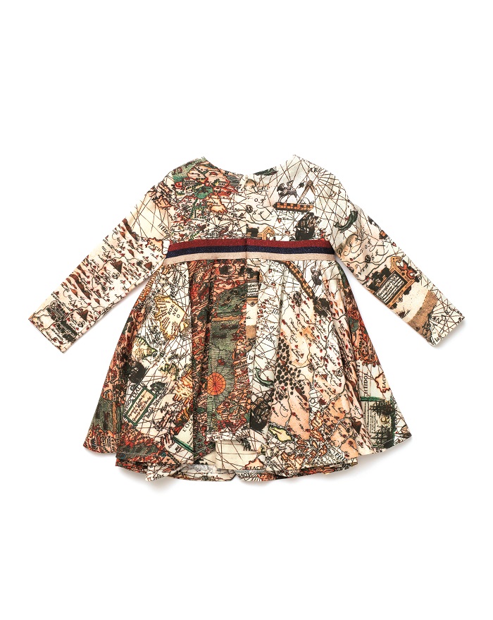 20 años de viaje en un mapa mundi que lleva el vestido Jazmin. En la foto detalle de la parte trasera.